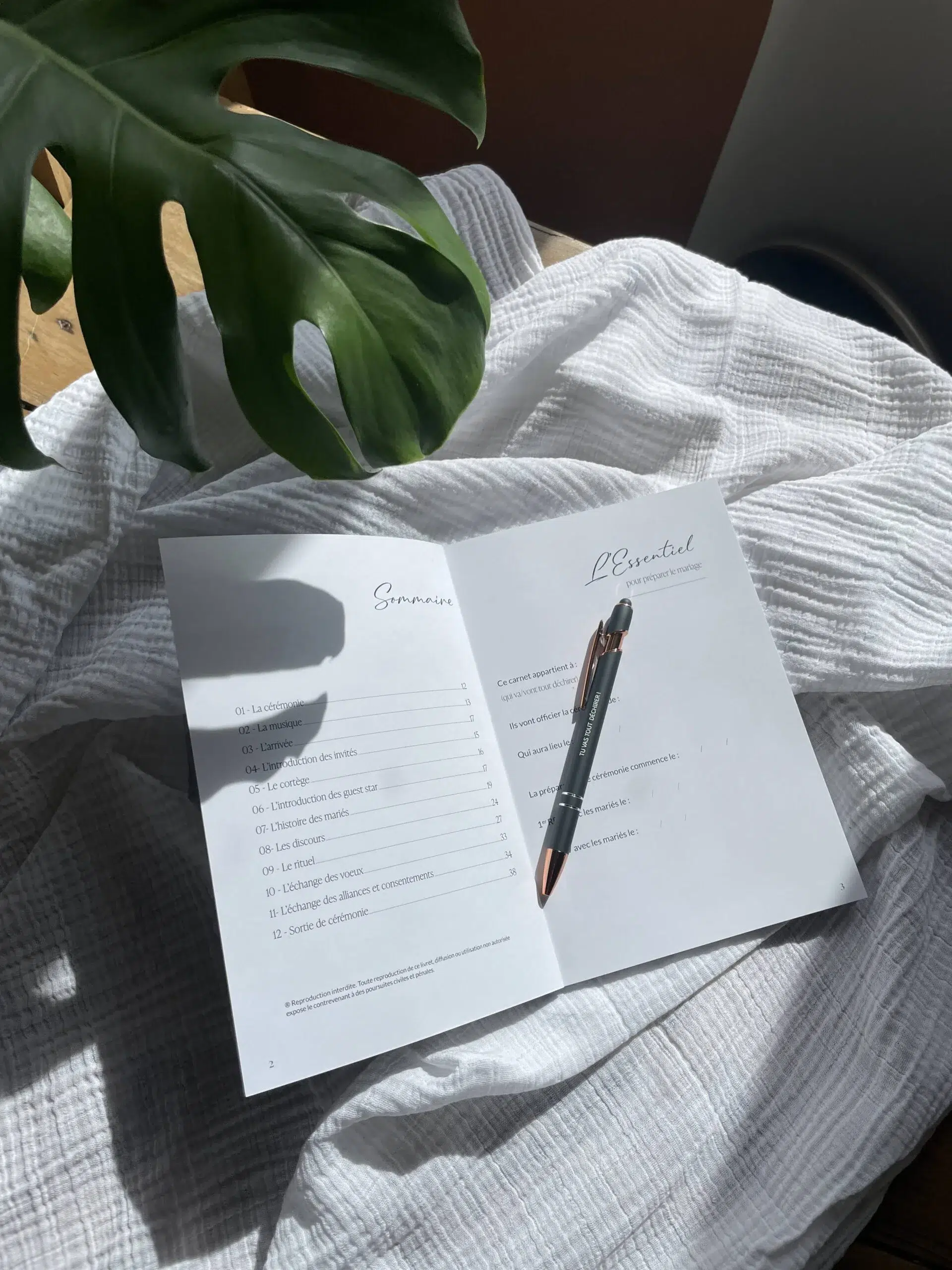 • Un carnet ultra-pratique de 42 pages pour l’accompagner pas à pas dans la création et l’écriture de la cérémonie. Dans ce carnet, il (ou elle) retrouvera TOUS mes conseils pour préparer et officier la cérémonie. Mais ce n’est pas tout ! Des QR codes présents dans le carnet l’emmèneront vers des tutos vidéos que j’ai tourné pour le guider au maximum